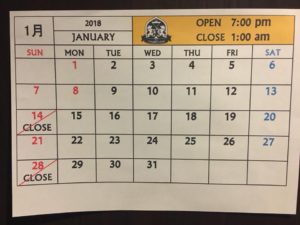 TOSHIRO’S BAR will be closed on the following Sundays, January 14 and 28.