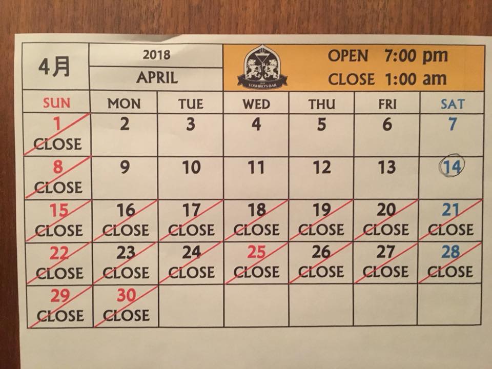 One more news here! For the schedule of April, TOSHIRO’S BAR will be closed every Sunday, and will finish this season’s business on April 14.✌︎(‘ω’✌︎ )