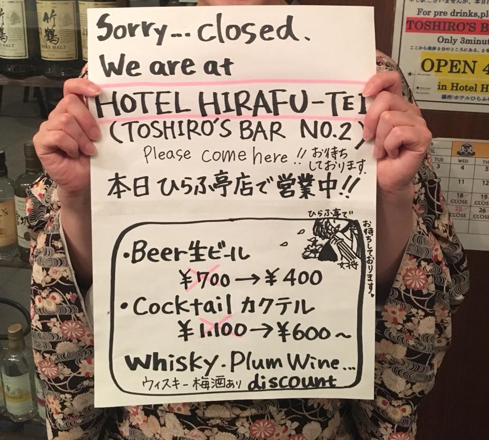 Please be noted that TOSHIRO’S BAR is closed today for the “THANK YOU 17-18 Season” night at TOSHIRO’S BAR -LOUNGE- in Hirafutei hotel. Both Toshiro and Okami will be there all the night tonight.