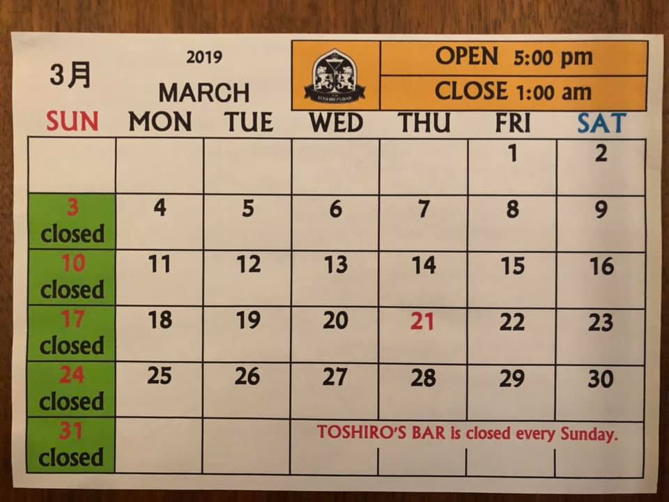 TOSHIRO’S BAR and the sister bar, TOSHIRO’S BAR -LOUNGE- are closed every Sunday in March.